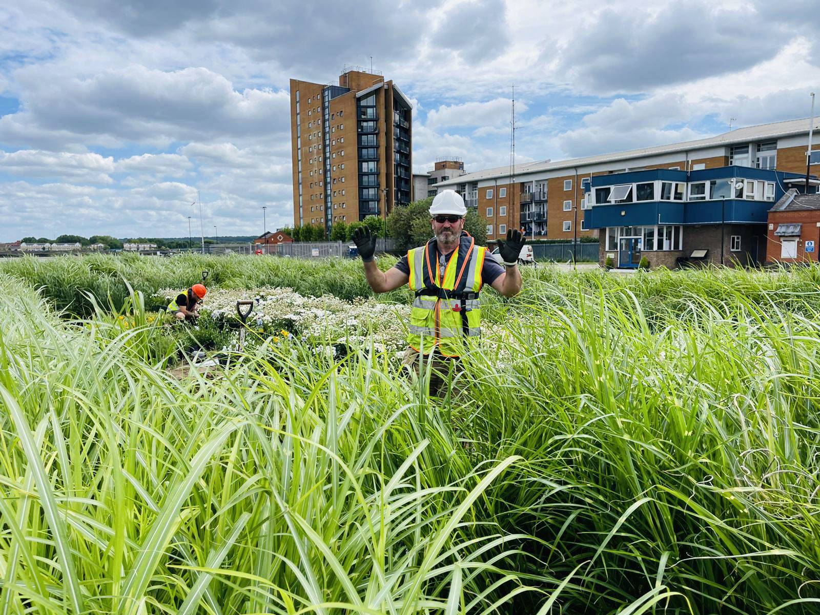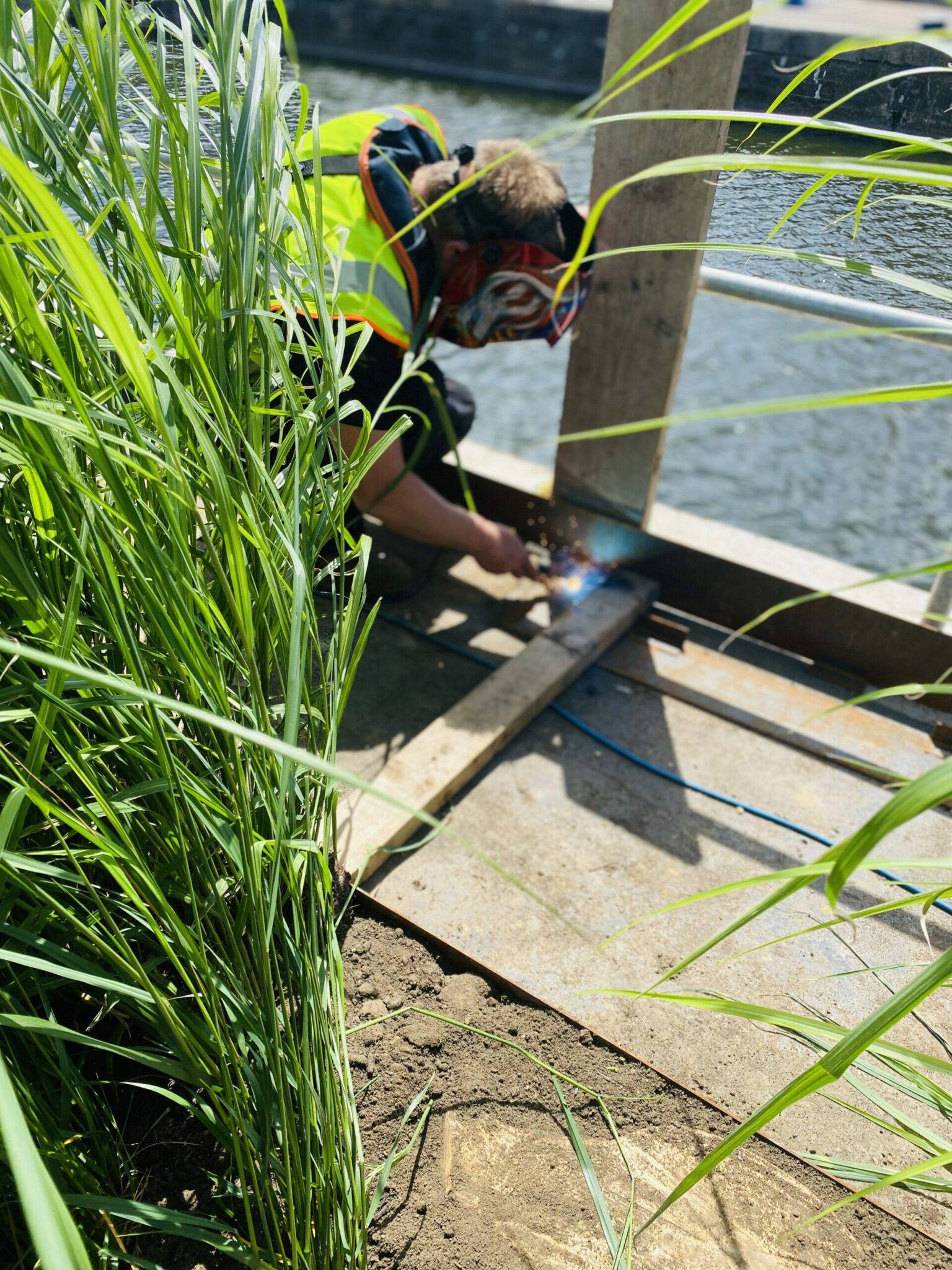 The whole project was built in 5x 12hr days by team of 10 and utilised specialist equipment like a 20t excavator with long reach arm and grab. This required specialist transport and road closures to be organised to get this onto the docks. The team then had to literally move heaven and earth or rather over 6000 plants, 80 tons of topsoil, 20 tons of self-binding gravel and weld to the deck 200 meters of steel edge….. wearing lifejackets! The #landscaperswearlifejackets was born.