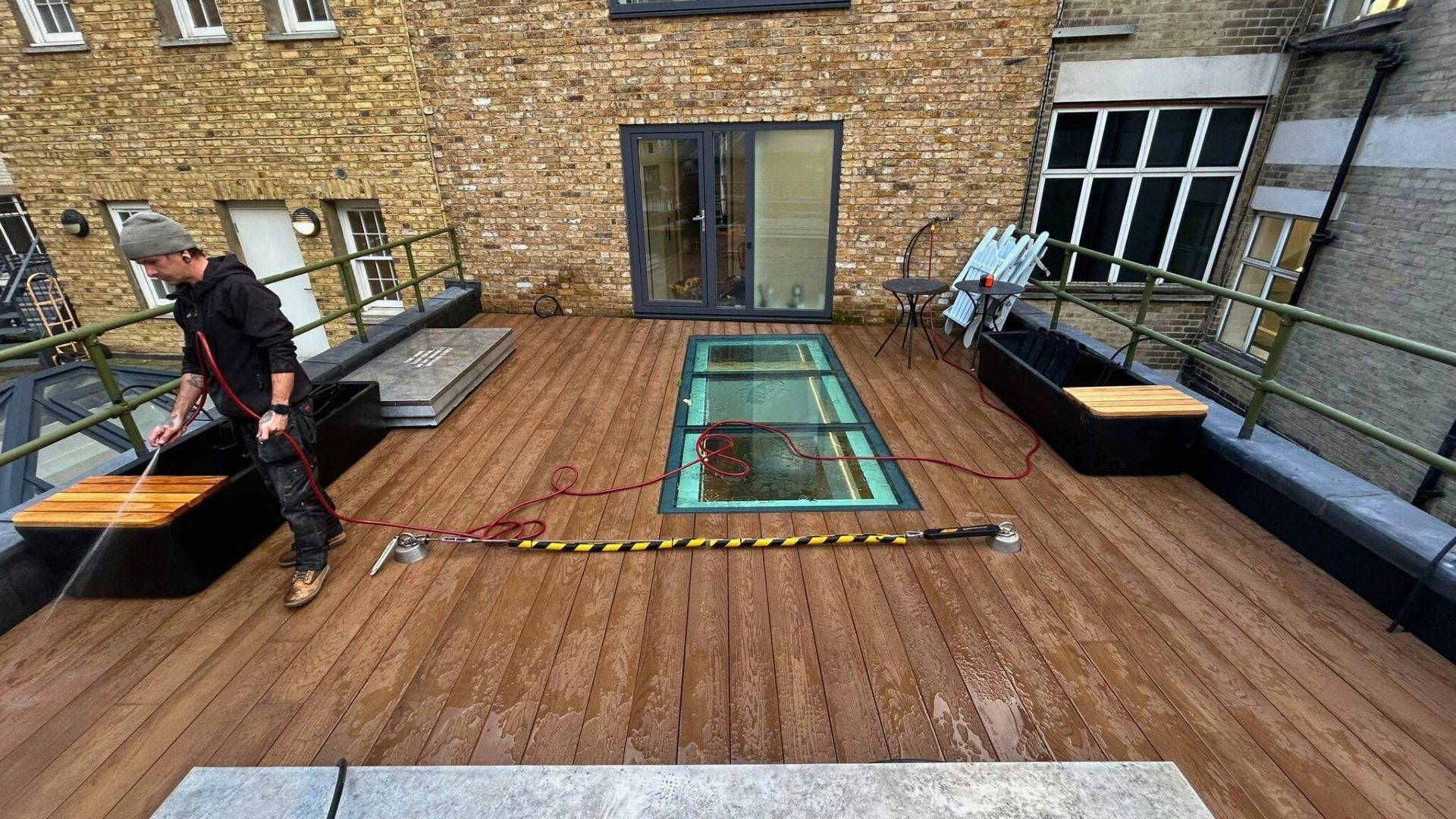 In our feasibility we had to assess roof loads and work with the original architectural design team to consider what the roof could take.  Our brief was to offer a paved option as well as a decked solution for Longchamp to consider.  We needed to find an answer that was sympathetic to the building, would not be a liability to its functionality or be in danger of overloading the structure and be equally as luxurious and high quality as all the Longchamp merchandise within.  Everything had to be calculated and ultimately we actually reduced the roof load and stress on the building through delivering our specification.  For these reasons they chose lightweight Millboard decking.